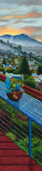 Eric is excited by the creative opportunity the extreme vertical format affords. He explains “This is how we see the world, through a window of layers. In the foreground we may see a no-parking sign, then a bus, next a soaring bridge and finally we see hills or dusky skies.” Each scene combines realism, landscape and bold graphic design. The original works are oil on board 12” by 48”.